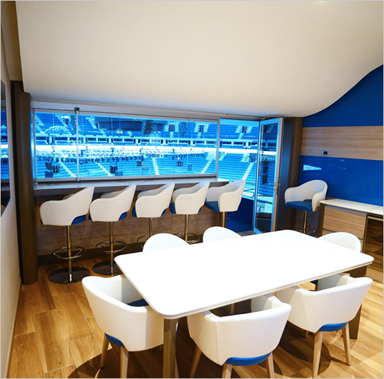 Ложа включает гостевую комнату, балкон с 12 посадочными местами и санитарный узел. В гостевой комнате предусмотрены обеденный стол, 6 мягких и 6 барных стульев, журнальный стол, диван, телевизор диагональю 115 см, кухонный гарнитур, холодильная камера, холодильная камера для вин, шифоньер.